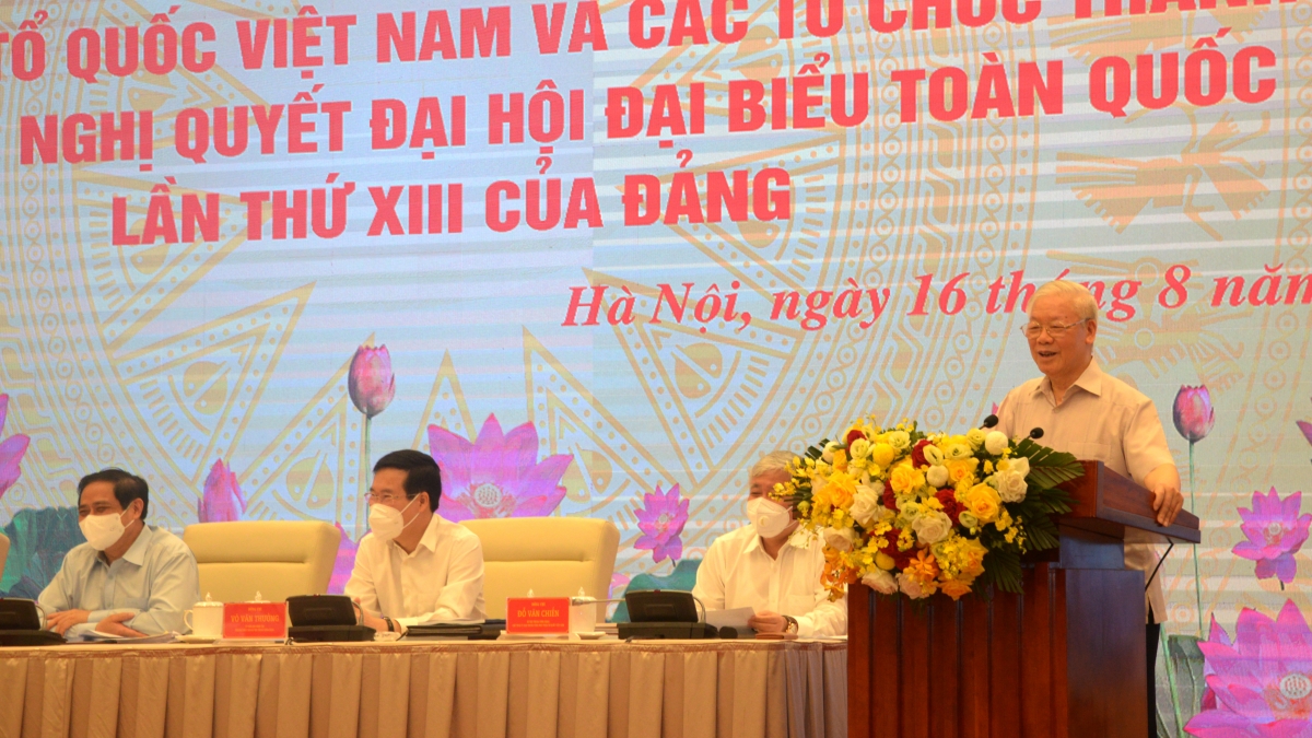 Phát biểu chỉ đạo tại hội nghị, Tổng Bí thư Nguyễn Phú Trọng nhấn mạnh, để thực hiện cho được phương hướng, nhiệm vụ, mục tiêu cơ bản của Nghị quyết Đại hội Đảng toàn quốc lần thứ XIII, không có cách nào khác là chúng ta phải phát huy được sức mạnh đại đoàn kết của toàn dân tộc kết hợp với sức mạnh thời đại dưới sự lãnh đạo đúng đắn, sáng suốt của Đảng; đẩy mạnh toàn diện, đồng bộ công cuộc đổi mới, công nghiệp hoá, hiện đại hoá; xây dựng và bảo vệ vững chắc Tổ quốc, giữ vững môi trường hoà bình, ổn định.