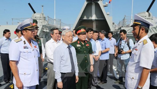 Tổng Bí thư Nguyễn Phú Trọng thăm tàu hộ vệ tên lửa Lý Thái Tổ. (Ảnh: Trí Dũng/TTXVN)