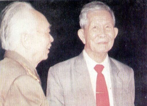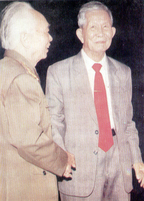 Đại tướng Võ Nguyên Giáp và Giáo sư Trần Văn Giàu - đồng Chủ tịch Hội Khoa học lịch sử Việt Nam tại Đại hội III (năm 1995) ở Hà Nội