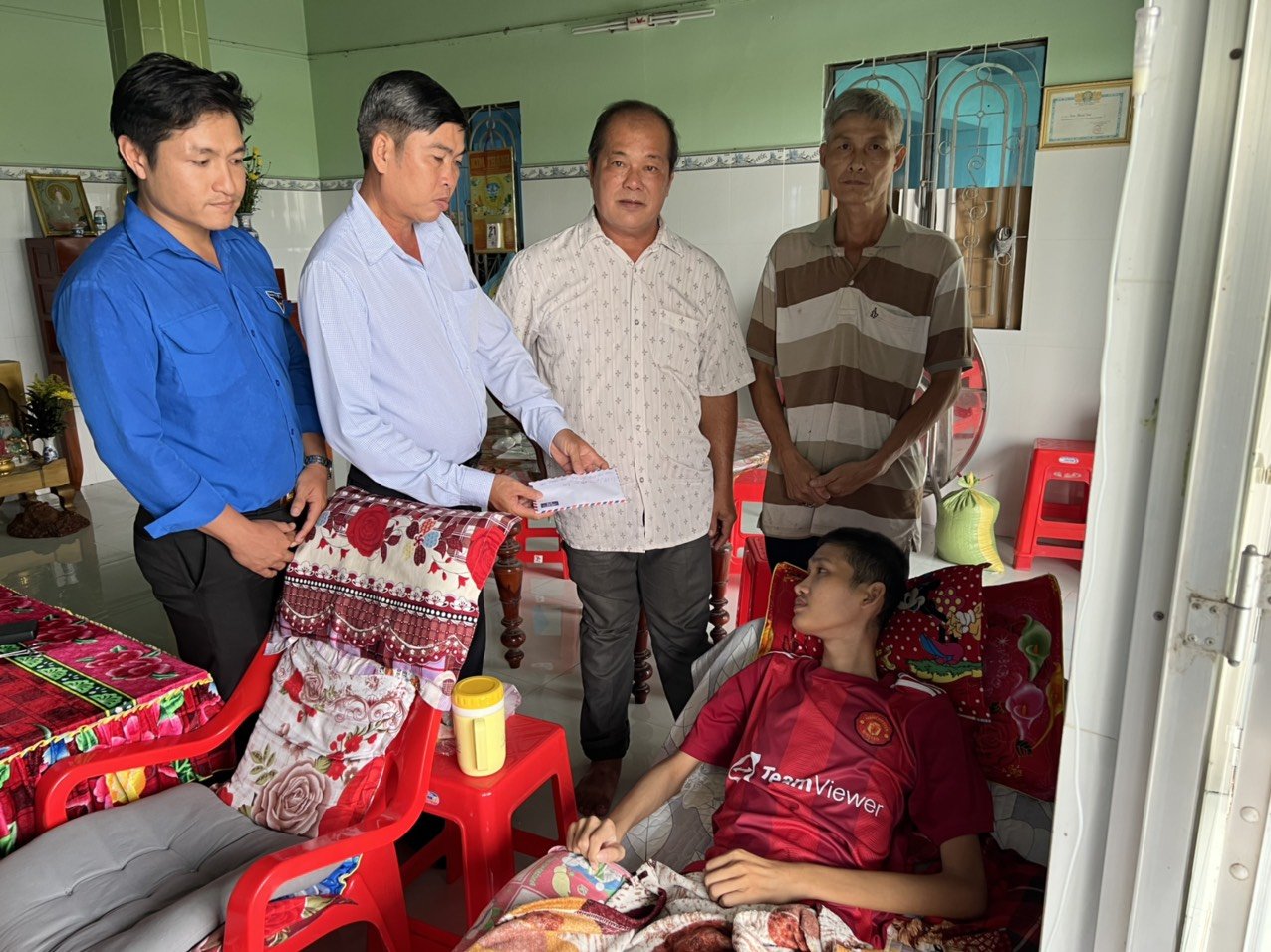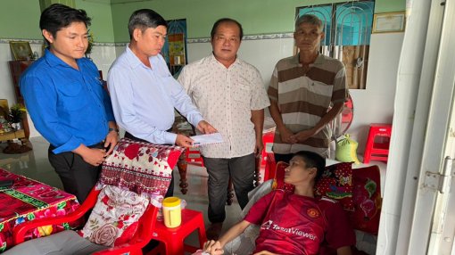 Đại diện Báo Công An TP.HCM, chính quyền địa phương trao số tiền hơn 14 triệu đồng của mạnh thường quân giúp đỡ cho em Trần Thanh Tiến (SN 1998, ngụ ấp 1, xã Quê Mỹ Thạnh, huyện Tân Trụ, tỉnh Long An) do mắc bệnh hiểm nghèo.