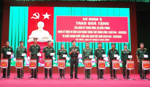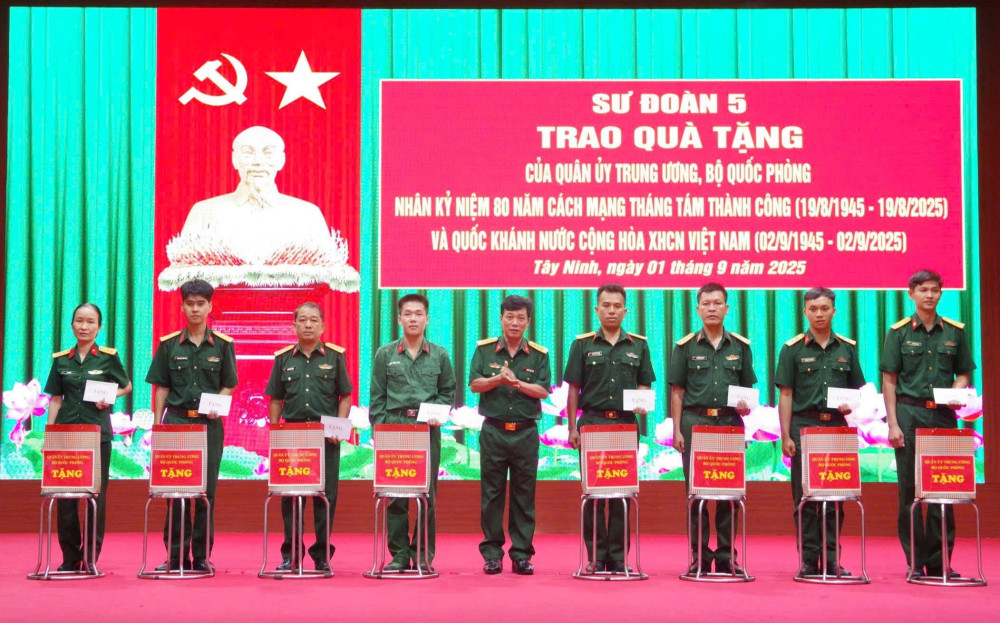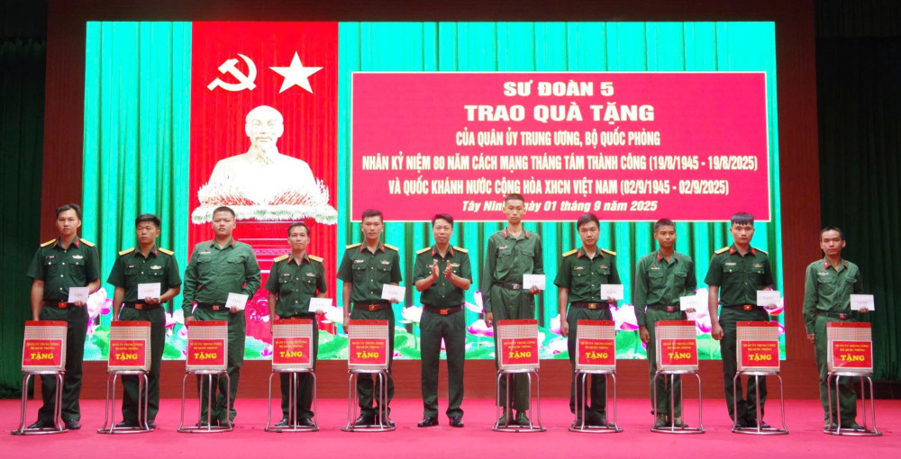 Ngày 01/9, Sư đoàn 5 (Quân khu 7) tổ chức trao tặng quà của Quân ủy Trung ương - Bộ Quốc phòng cho cán bộ, chiến sĩ có hoàn cảnh đặc biệt khó khăn nhân kỷ niệm 80 năm Cách mạng Tháng Tám và Quốc khánh 02/9. Đại tá Trần Hoàng Giang - Chính ủy Sư đoàn đến dự.