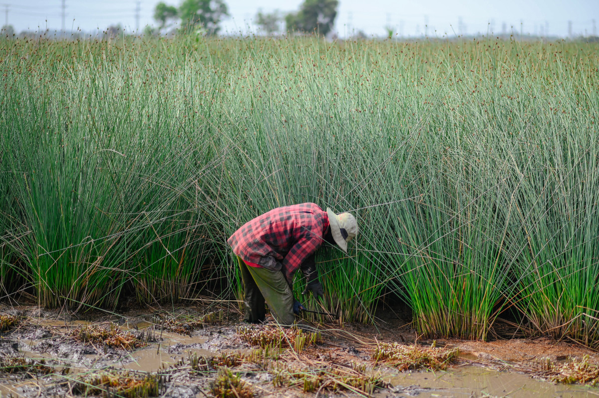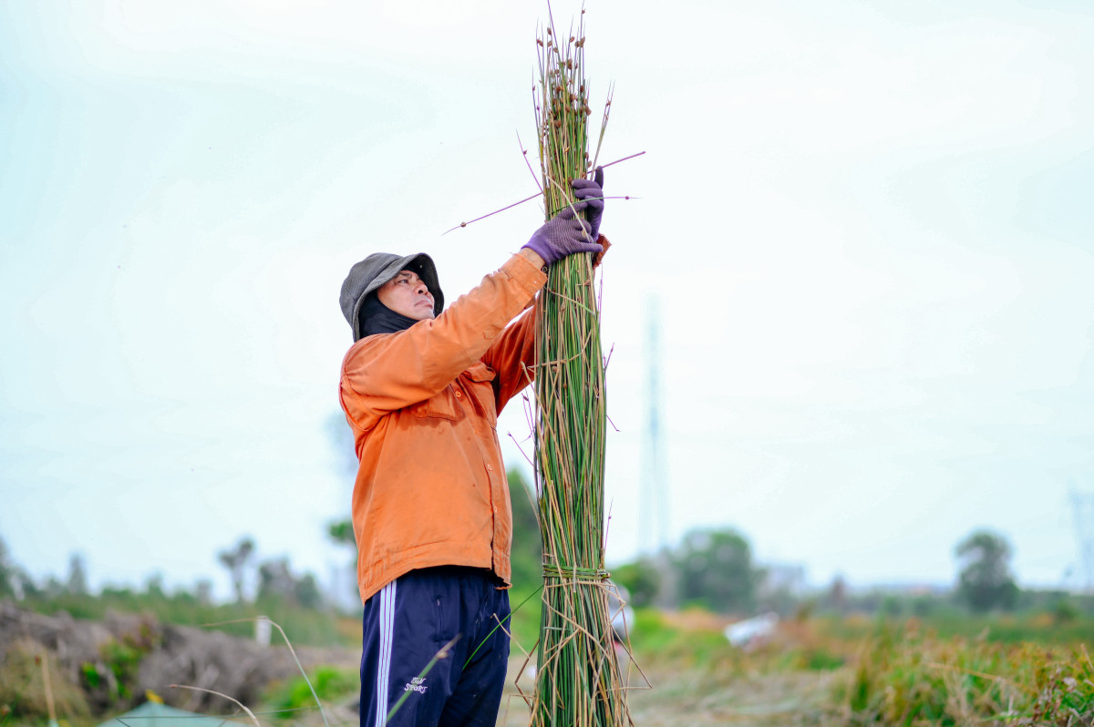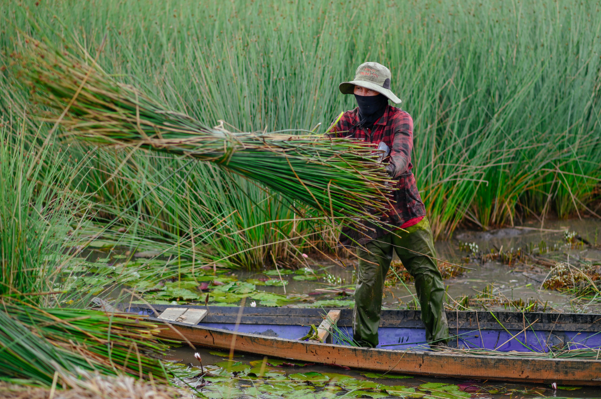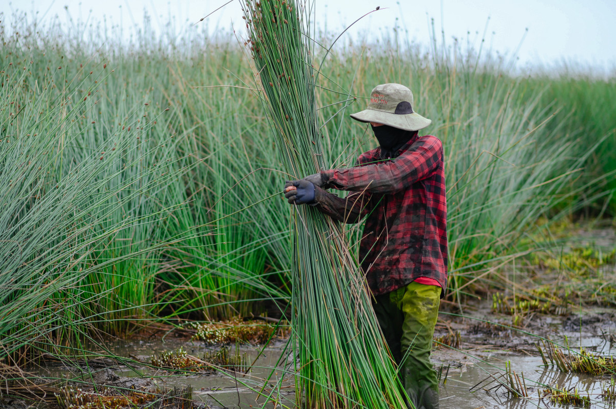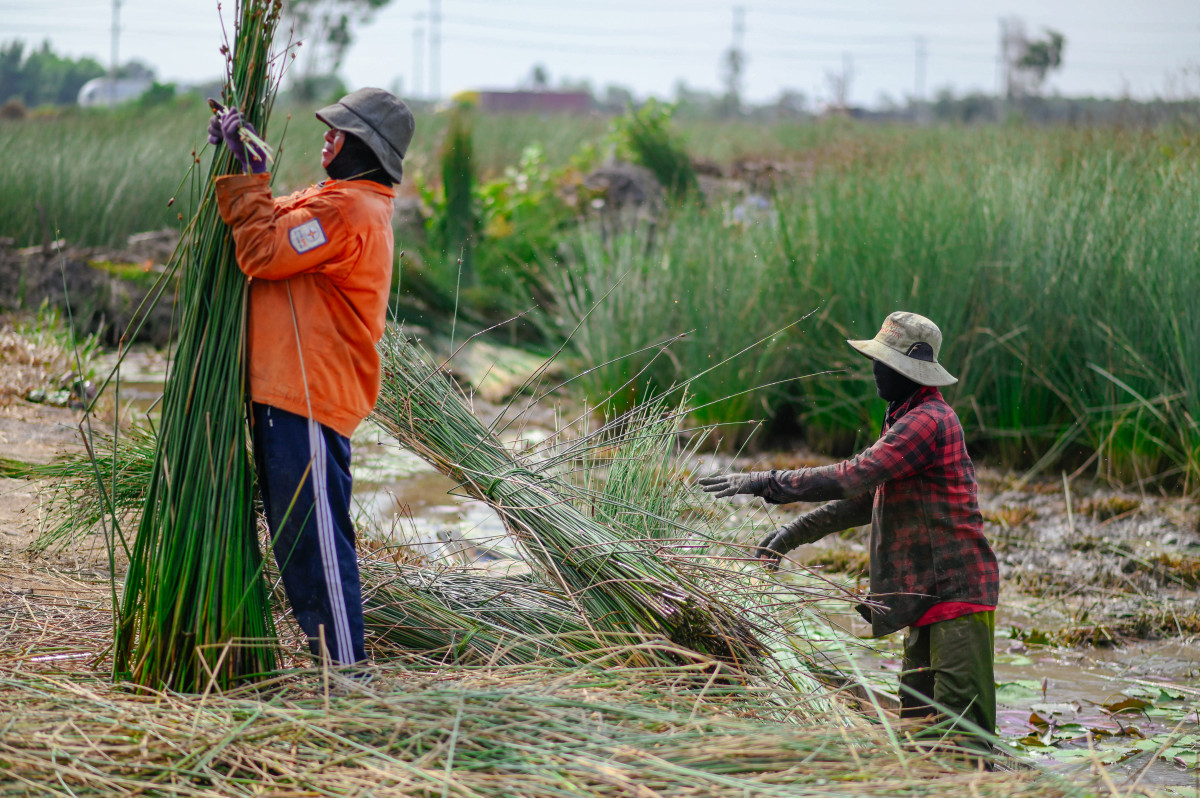 Vào mùa thu hoạch, người dân sẽ dùng lưỡi liềm cắt tận gốc cỏ bàng và cắt theo từng khóm