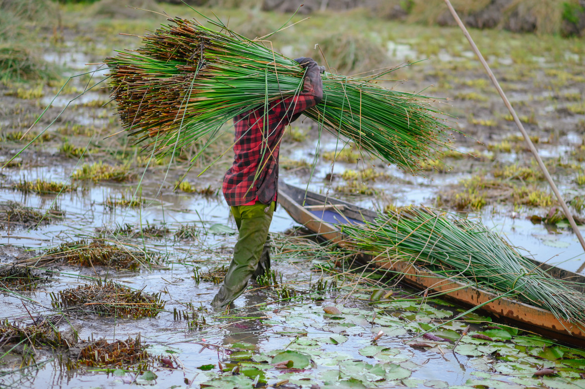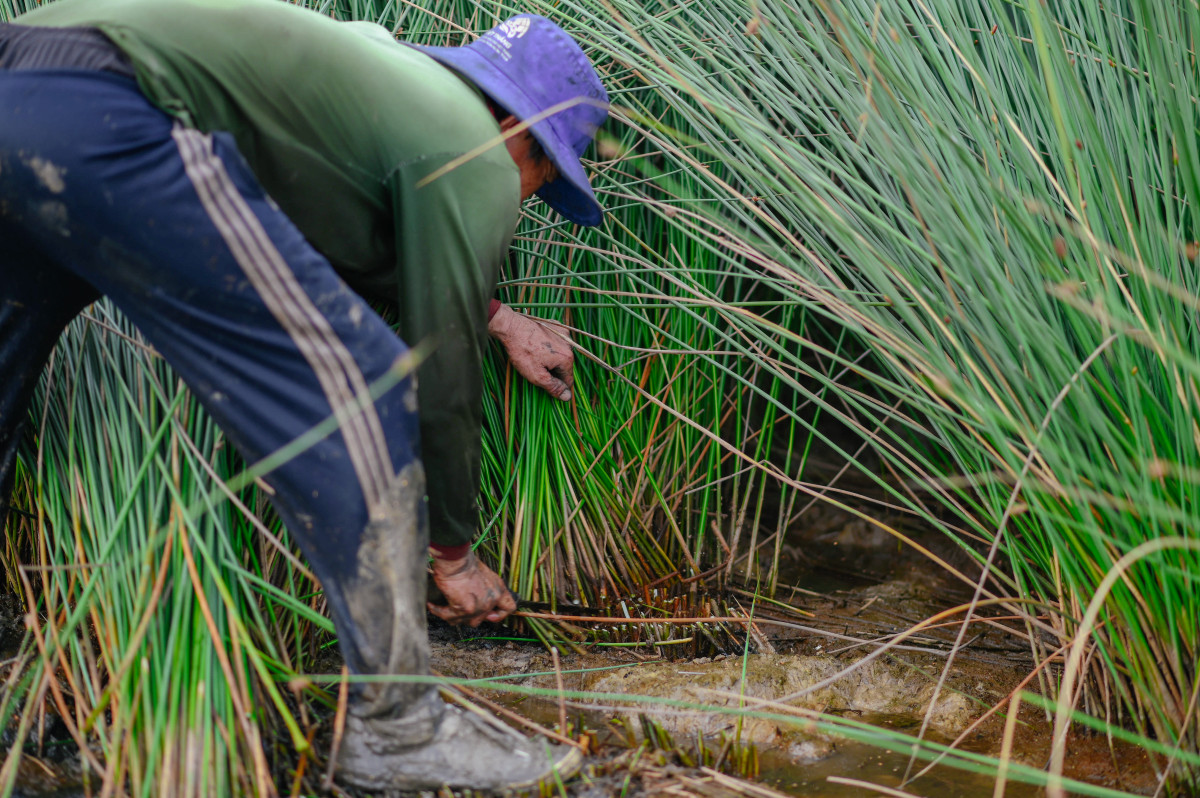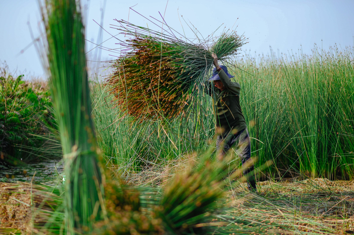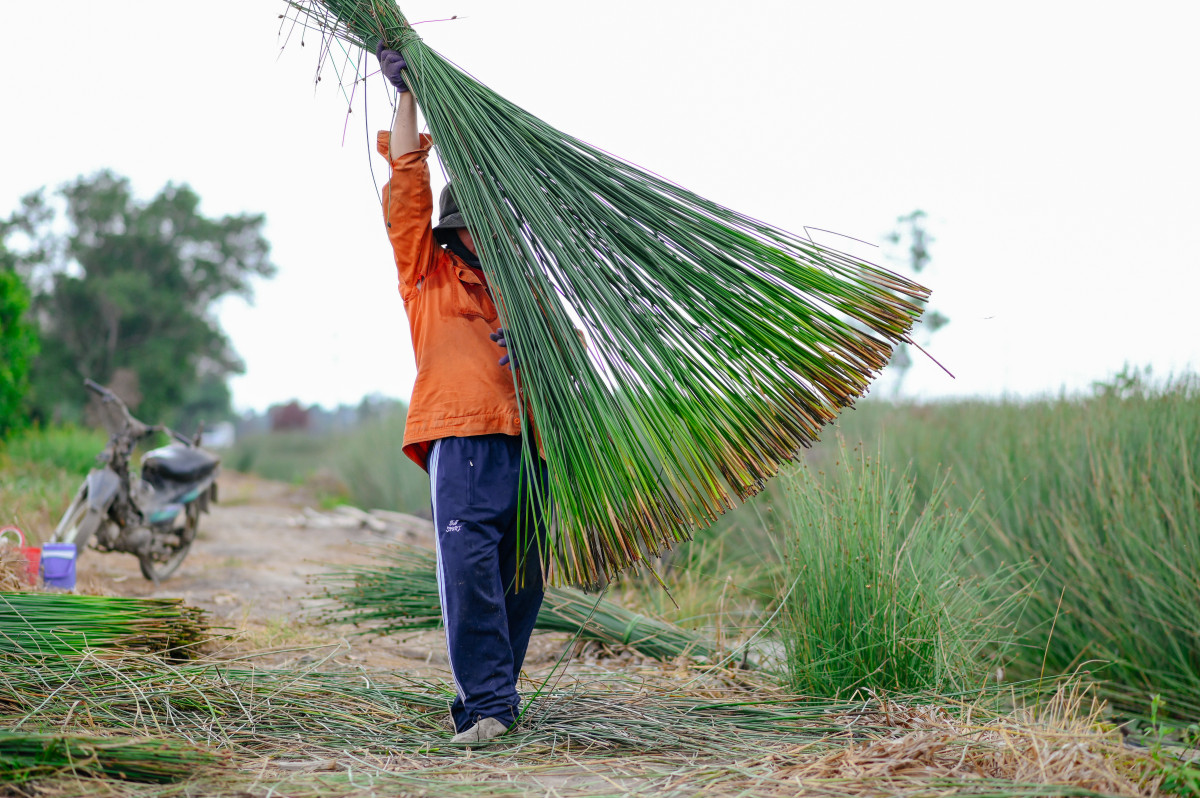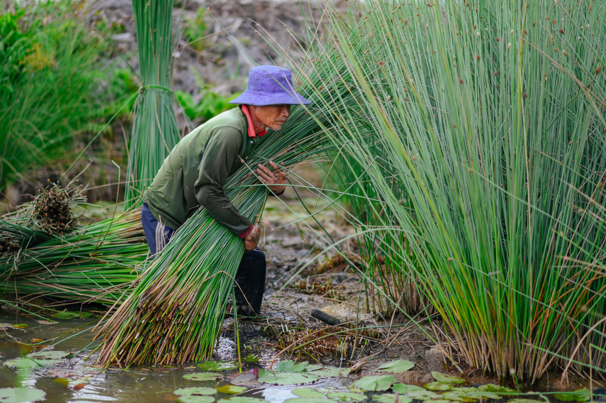 Vào mùa thu hoạch, người dân sẽ dùng lưỡi liềm cắt tận gốc cỏ bàng và cắt theo từng khóm