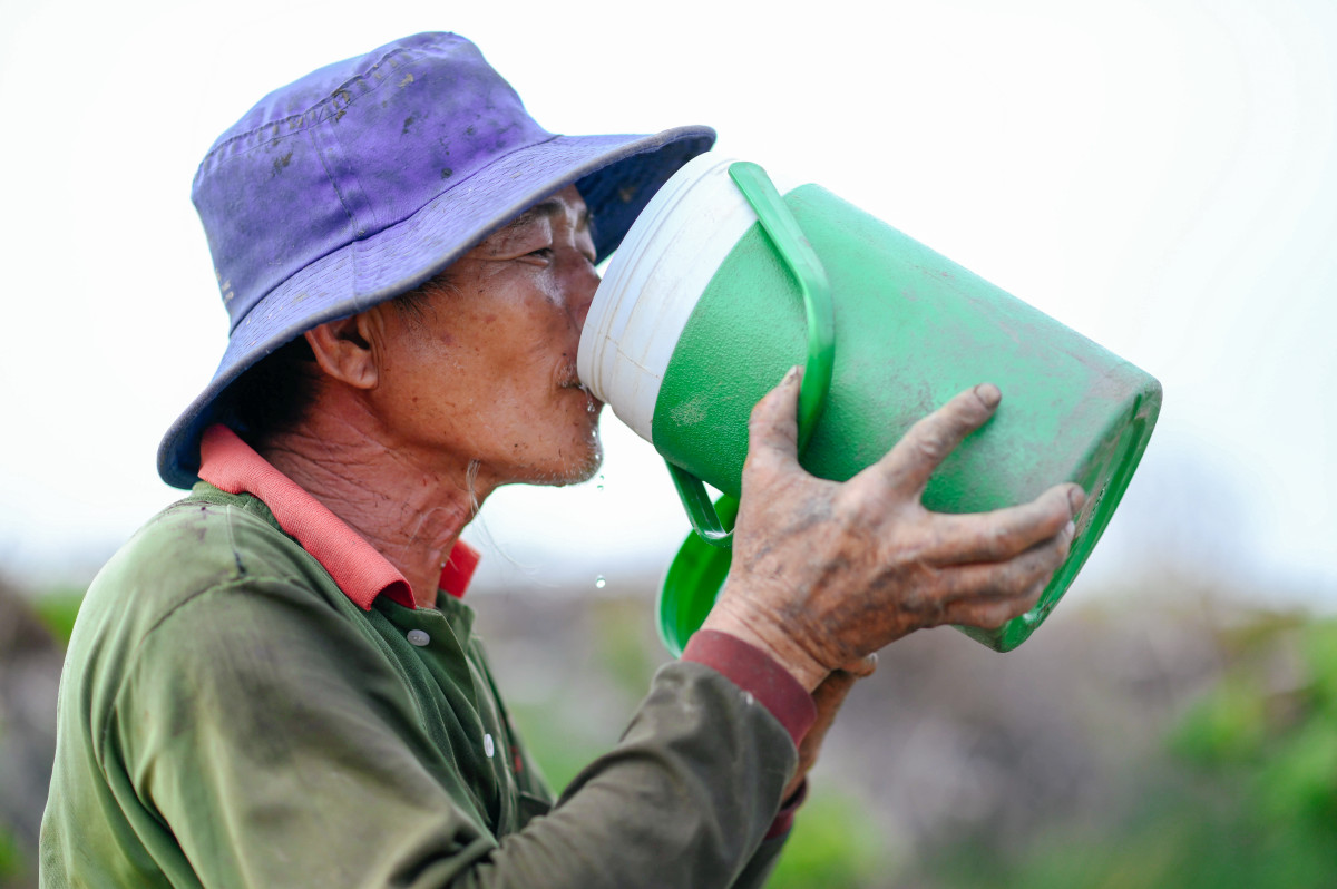 Phút nghỉ ngơi của ông Ngô Văn Bảy – người có gần 50 năm gắn bó với cây cỏ bàng. Theo ông Bảy, cỏ bảng từng chỉ được xem như cây cỏ dại nhưng với sự phát triển của nghề thủ công mỹ nghệ, cây cỏ bàng trở thành nguyên liệu sản xuất. Dù nghề trồng cỏ bàng có vất vả nhưng đây cũng là cây trồng giúp nhiều hộ dân có thu nhập ổn định