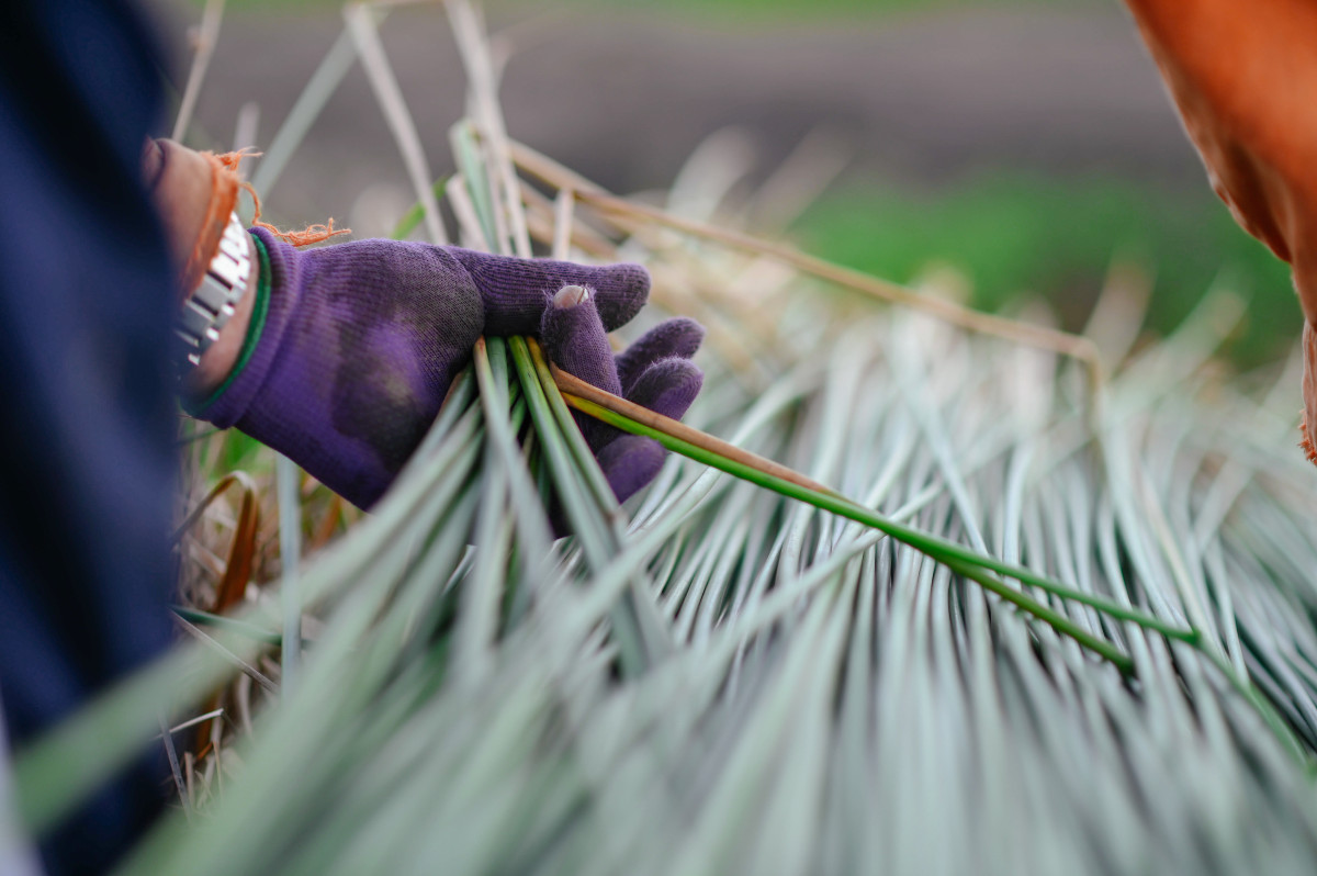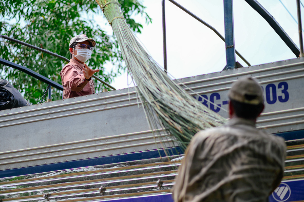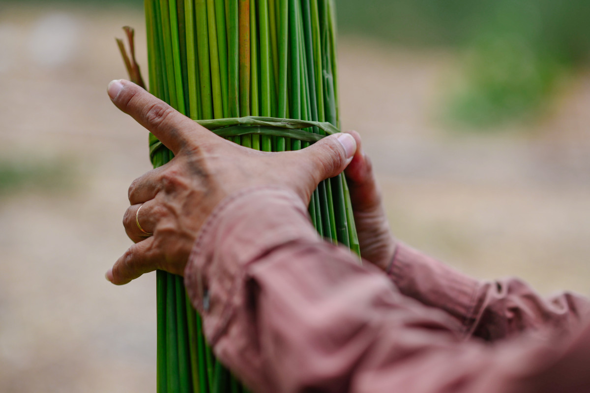 Những bó cỏ bàng được thương lái ướm thử kích cỡ và đúng chuẩn theo từng loại 1 và 2 để thu mua