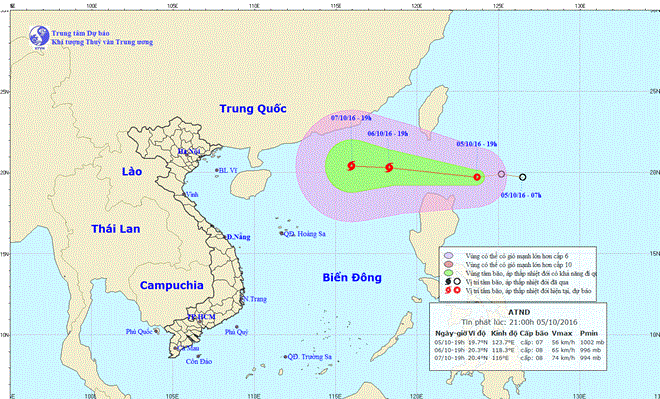 Theo Trung tâm Dự báo khí tượng thủy văn Trung ương, hồi 19 giờ ngày 5/10, vị trí tâm áp thấp nhiệt đới ở vào khoảng 19,7 độ Vĩ Bắc; 123,7 độ Kinh Đông, cách đảo Luzon khoảng 230km về phía Đông Bắc.