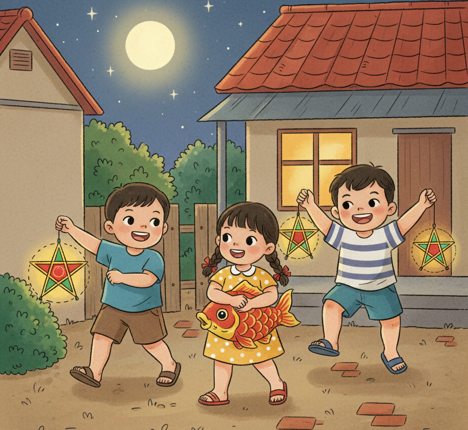 Trước ngày Trung thu, nó hì hục làm xong hai cái lồng đèn ông sao cho hai anh em chơi. Em nó thích lắm, vui vẻ cười đùa, còn cầm lồng đèn đi khoe các bạn trong xóm. Bà ngoại cũng khen nó giỏi, tí tuổi đầu đã biết làm lồng đèn.