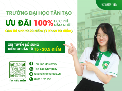 Trường Đại học Tân Tạo miễn phí 100% học phí năm đầu cho thí sinh xét tuyển bổ sung đạt từ 20 điểm