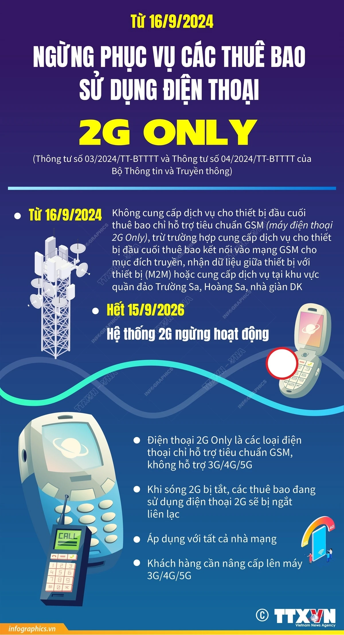 Theo Thông tư số 03/2024/TT-BTTTT và Thông tư số 04/2024/TT-BTTTT của Bộ Thông tin và Truyền thông, từ 16/9/2024, không cung cấp dịch vụ cho thiết bị đầu cuối thuê bao chỉ hỗ trợ tiêu chuẩn GSM, trừ trường hợp cung cấp dịch vụ cho thiết bị đầu cuối thuê bao kết nối vào mạng GSM cho mục đích truyền, nhận dữ liệu giữa thiết bị với thiết bị (M2M) hoặc cung cấp dịch vụ tại khu vực quần đảo Trường Sa, Hoàng Sa, nhà giàn DK.