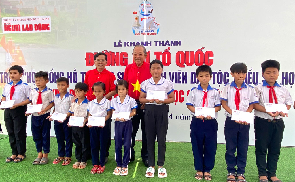 Trong khuôn khổ lễ khánh thành Đường cờ Tổ quốc, trao “Học bổng hỗ trợ học sinh, sinh viên dân tộc thiểu số, học sinh nghèo” do nguyên Ủy viên Bộ Chính trị, nguyên Phó Thủ tướng Thường trực Chính phủ, Chủ tịch danh dự Chương trình Tự hào cờ Tổ Quốc - Trương Hòa Bình sáng lập, Báo Người Lao Động tiếp nhận và quản lý, phối hợp mạnh thường quân trao 100 suất học bổng (mỗi suất 1 triệu đồng) cho học sinh có hoàn cảnh khó khăn khu vực biên giới huyện Vĩnh Hưng. Được quan tâm tặng học bổng, em Hồ Minh Đạt (học sinh lớp 3, Trường Tiểu học Thái Bình Trung, huyện Vĩnh Hưng) cho biết: "Em rất phấn khởi khi được các cô, chú lãnh đạo tặng học bổng. Phần quà này em gửi mẹ để trang trải cuộc sống và việc học. Em sẽ cố gắng học tập để trở thành công dân có ích cho xã hội, không phụ lòng các mạnh thường quân”.