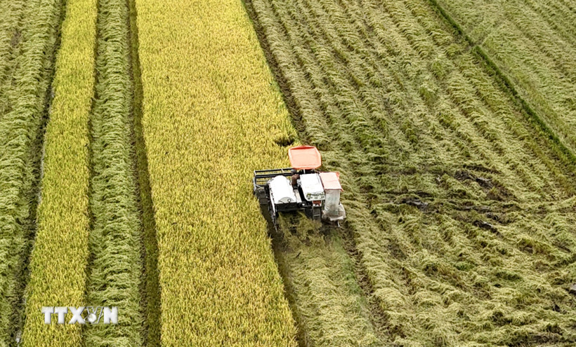 Máy gặt đập liên hợp thu hoạch trên cánh đồng lúa chín vàng tại thành phố Long xuyên, tỉnh An Giang. (Ảnh: Thanh Sang/TTXVN)