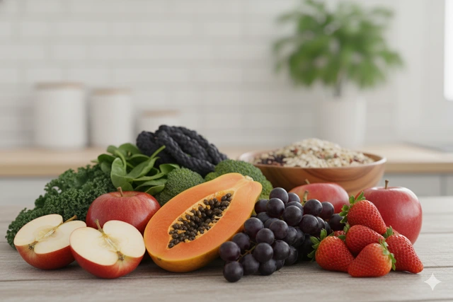 Ăn nhiều rau xanh, trái cây, ngũ cốc nguyên hạt giúp phòng ngừa ung thư đại tràng. Ảnh: AI