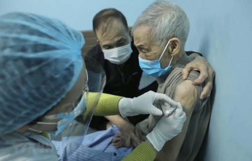 Nhân viên y tế tiêm vaccine phòng COVID-19 cho người cao tuổi phường Đồng Tâm (quận Hai Bà Trưng). (Ảnh: Minh Quyết/TTXVN)