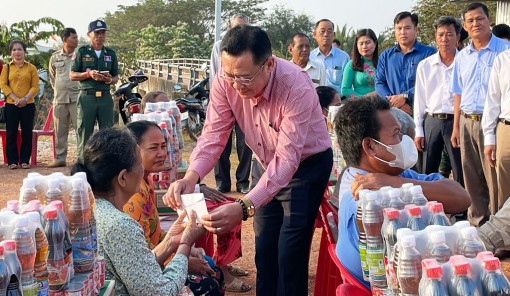 Ủy ban Mặt trận đoàn kết phát triển Tổ quốc Campuchia tỉnh Prey Veng và UBMTTQ Việt Nam tỉnh Long An tặng quà cho hộ nghèo 2 bên biên giới