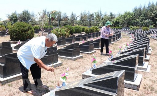 Ông Huỳnh Đồng (nguyên Trung đội trưởng Trinh sát-Đoàn 10) và bà Phạm Thị Nhung (cán bộ y tá Đoàn 10) thắp nhang cho các đồng đội tại Nghĩa trang Liệt sỹ Rừng Sác. (Ảnh: Xuân Khu/TTXVN)