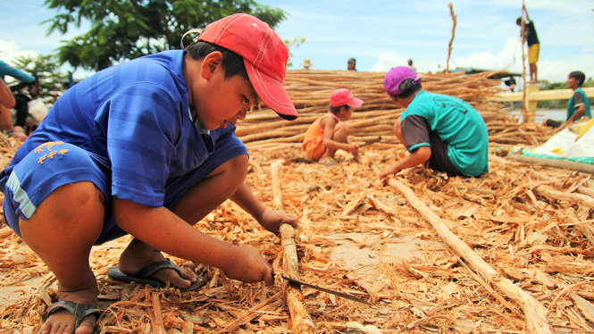 Ăn theo mùa nước nổi, em Phương Nam (12 tuổi, xã Vĩnh Hội Đông, huyện An Phú, An Giang) cũng tranh thủ đi chuốt cây tràm mướn, mỗi ngày kiếm được 40.000 - 50.000 đồng - Ảnh: MẬU TRƯỜNG