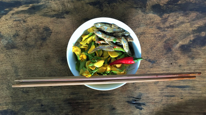 Trong mâm cơm của người miền Tây những ngày này không thể thiếu món cá linh kho lạt ăn với bông điên điển - Ảnh: MẬU TRƯỜNG