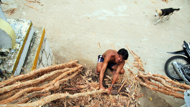 Vựa tràm của ông Nguyễn Văn Huyện nằm bên một nhánh sông Châu Đốc, huyện An Phú, An Giang. Theo ông, năm nay người dân đạt dớn nhiều nên lượng tràm bán có ra có thể lên đến 4.000 - 5.000 cây, mỗi cây giá 11.000 đồng - Ảnh: MẬU TRƯỜNG