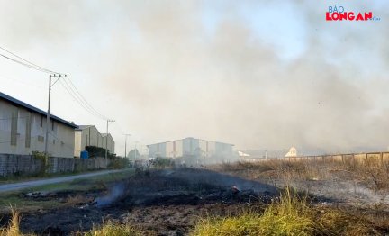 Đám cháy từ khu vực cỏ hoang dần lan sang Cty bên cạnh. May mắn, lực lượng chữa cháy khu công nghiệp kịp thời điều 4 xe chữa cháy tham gia cứu hỏa.