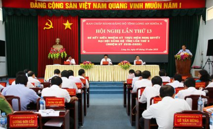 Ngày 09/10, Tỉnh ủy Long An tổ chức Hội nghị lần thứ 13, Ban Chấp hành Đảng bộ tỉnh khóa X, (nhiệm kỳ 2015-2020) nhằm sơ kết giữa nhiệm kỳ thực hiện Nghị quyết Đại hội Đảng bộ tỉnh, đánh giá tình hình thực hiện Nghị quyết Tỉnh ủy năm 2018 trong 9 tháng, xác định một số nhiệm vụ trọng tâm 3 tháng cuối năm.