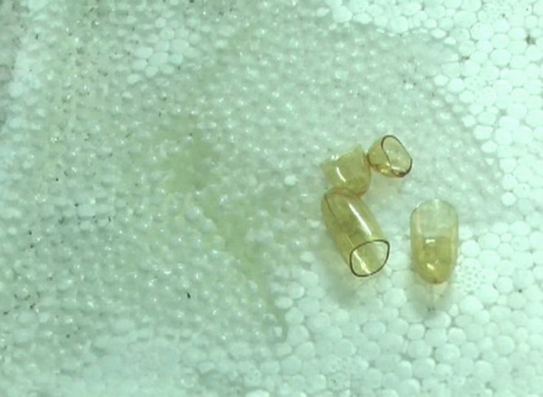 Khi đổ dầu cá Omega-3 Trung Quốc lên tấm xốp, chỉ ít phút tấm xốp bị ăn thủng trong khi làm tương tự với loại dầu cá khác thì không có hiện tượng này.