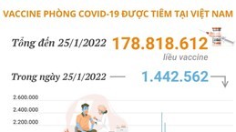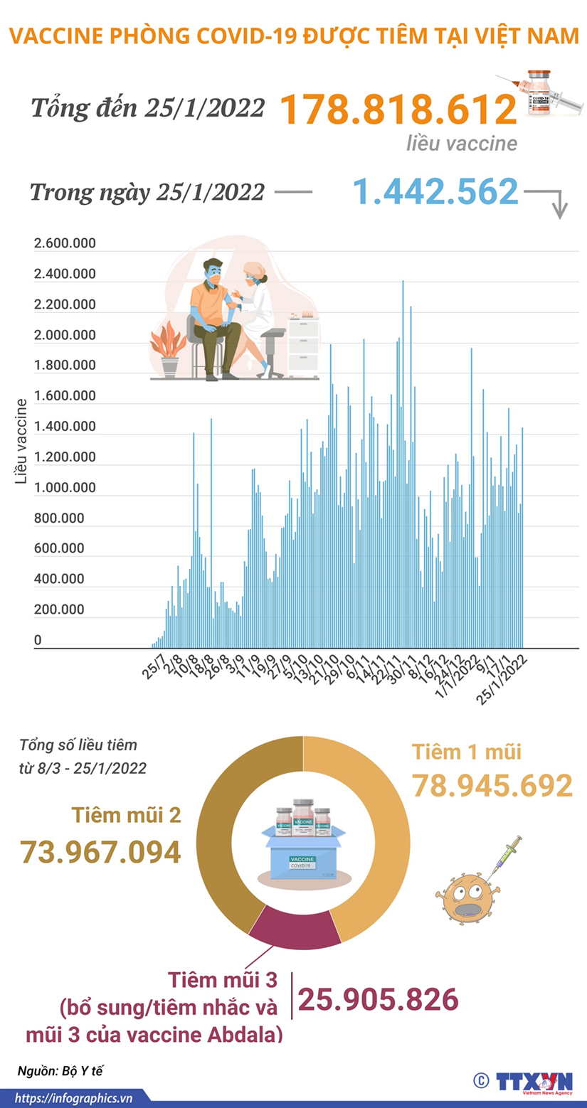 Trong ngày 25/1/2022 có 1.442.562 liều vaccine phòng COVID-19 được tiêm. Như vậy, tổng số liều vaccine đã được tiêm tại Việt Nam là 178.818.612 liều, trong đó tiêm 1 mũi là 78.945.692 liều, tiêm mũi 2 là 73.967.094 và tiêm mũi 3 (tiêm bổ sung/tiêm nhắc và mũi 3 của vaccine Abdala) là 25.905.826 liều./.
