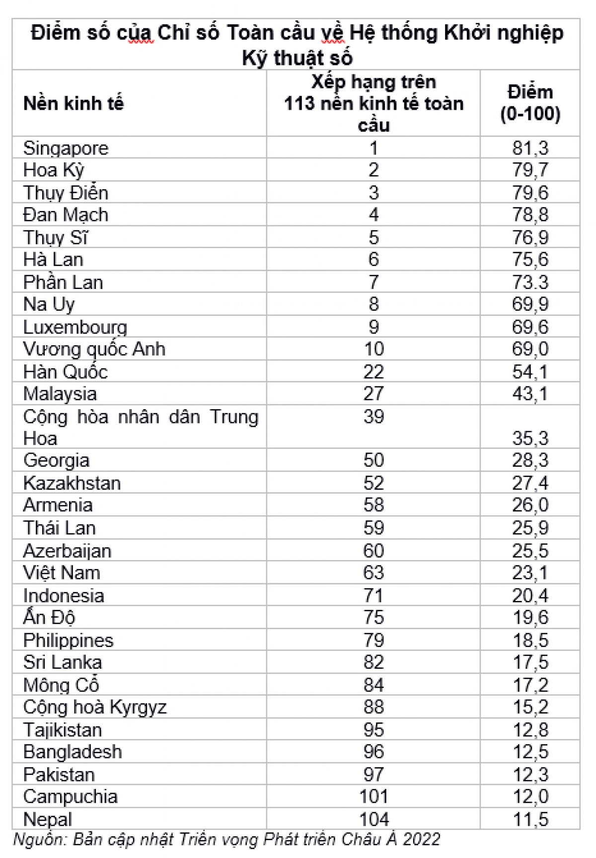 ADB cho biết, Việt Nam xếp thứ 63 trong số 113 quốc gia trong bảng xếp hạng toàn cầu về môi trường kỹ thuật số và hệ thống hỗ trợ doanh nghiệp khởi nghiệp.