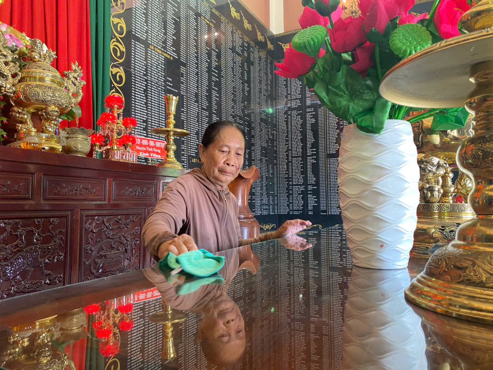 Bà Phùng Thị Mỹ (thương binh hạng 4/4, xã Vĩnh Hưng) gắn bó với nghĩa trang liệt sĩ gần 30 năm. Đối với bà, nơi đây còn hơn cả nhà, bởi những người đang nằm trong nghĩa trang là anh em, đồng đội, gắn bó máu thịt