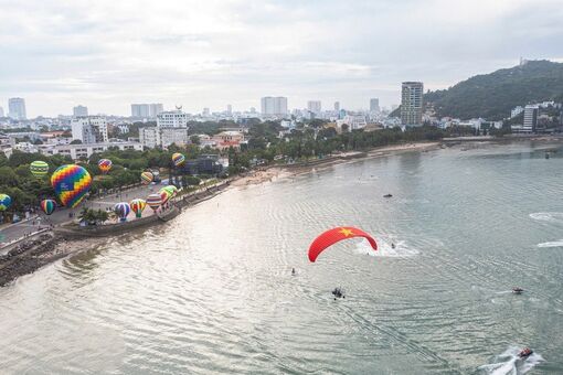 Các hoạt động thể thao nước, khinh khí cầu trình diễn tại khu vực Bãi Trước (phường Vũng Tàu) thu hút đông đảo người dân, du khách check-in, trải nghiệm (Ảnh: TTXVN phát)