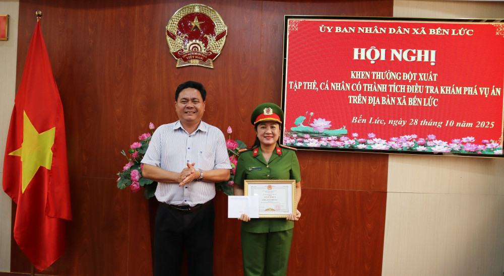 Chiều 28/10, lãnh đạo UBND xã Bến Lức, tỉnh Tây Ninh chủ trì tổ chức khen thưởng đột xuất cho 1 tập thể và 4 cá nhân cán bộ, chiến sĩ Công an xã vì đã có thành tích xuất sắc trong công tác điều tra, khám phá nhanh vụ án trộm cắp tài sản xảy ra trên địa bàn.