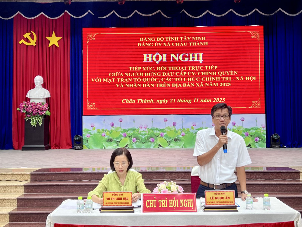 Sáng 21/11, xã Châu Thành, tỉnh Tây Ninh tổ chức Hội nghị tiếp xúc đối thoại trực tiếp giữa người đứng đầu cấp ủy, chính quyền với MTTQ, các tổ chức chính trị - xã hội và Nhân dân trên địa bàn xã năm 2025.