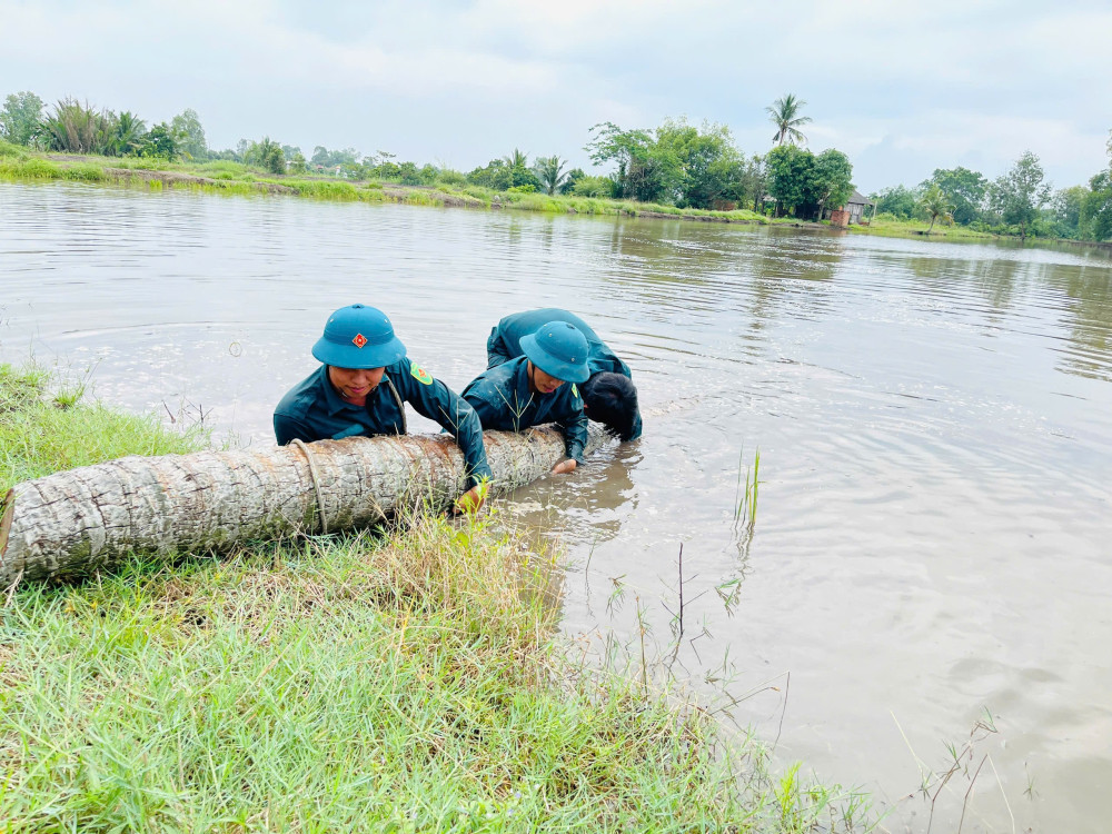 Trong hai ngày 21 và 22/10, trước tình hình mực nước sông Vàm Cỏ Đông dâng cao, xã Đức Huệ, tỉnh Tây Ninh huy động hàng chục cán bộ, chiến sĩ lực lượng dân quân thường trực cùng phương tiện cơ giới hỗ trợ người dân ngăn nước lũ, bảo vệ vườn cây.
