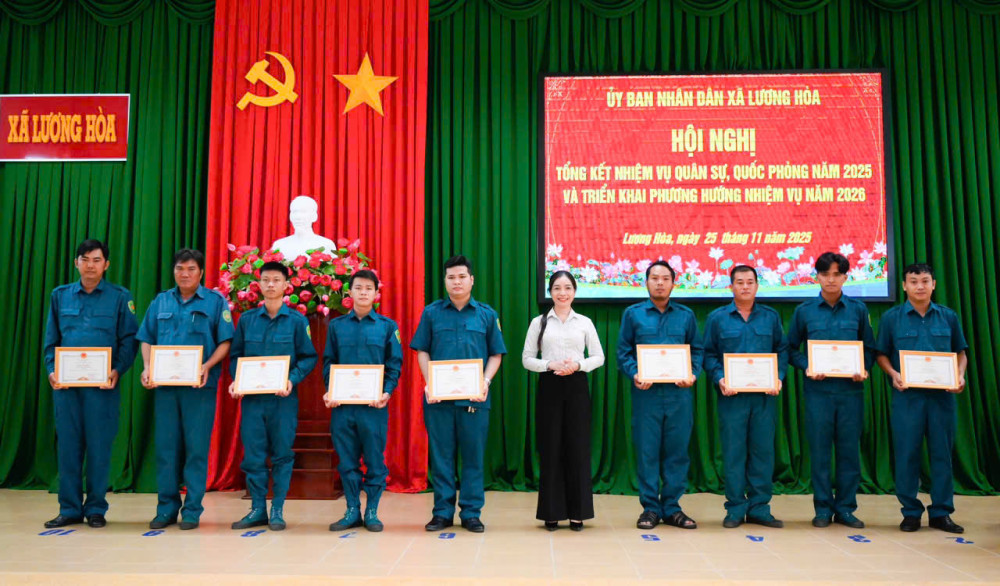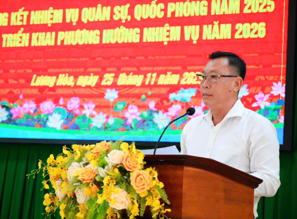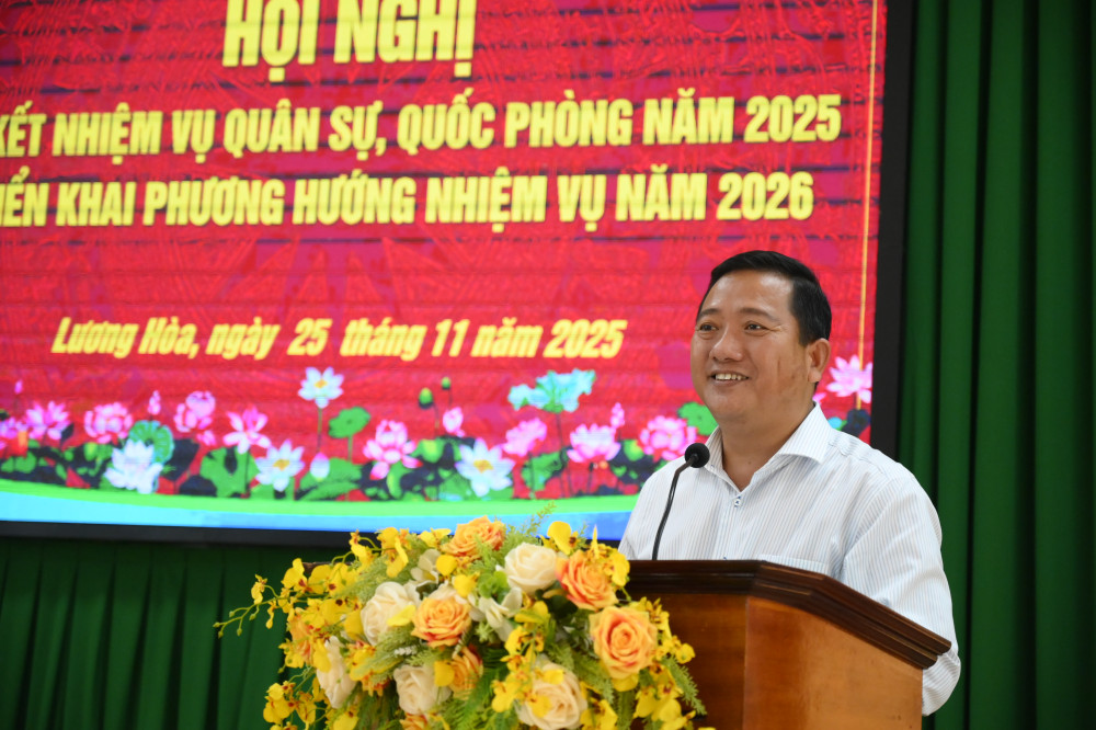 Sáng 25/11, UBND xã Lương Hòa, tỉnh Tây Ninh, tổ chức hội nghị tổng kết nhiệm vụ quân sự, quốc phòng địa phương năm 2025 và triển khai phương hướng nhiệm vụ năm 2026.