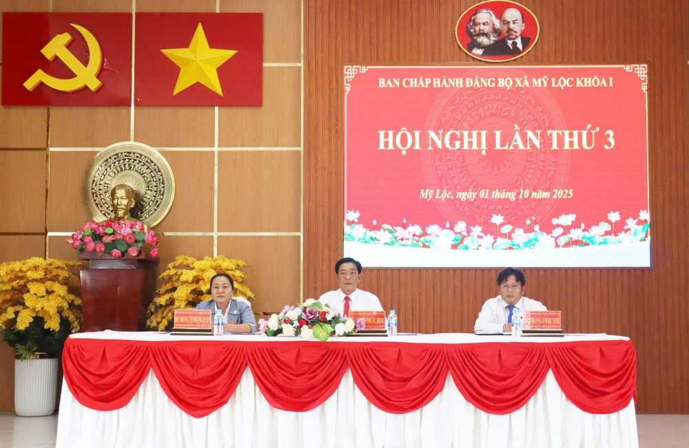 Ngày 01/10, Ban Chấp hành Đảng bộ xã Mỹ Lộc, tỉnh Tây Ninh (khóa I) tổ chức Hội nghị lần thứ 3 đánh giá tình hình thực hiện Nghị quyết Đảng ủy trong 9 tháng và một số nhiệm vụ trọng tâm 3 tháng cuối năm 2025; thảo luận, cho ý kiến dự thảo Nghị quyết về xây dựng “Xã không ma túy” và dự thảo chương trình làm việc của Ban Chấp hành Đảng bộ xã khóa I, nhiệm kỳ 2025-2030.