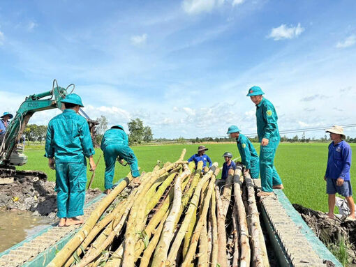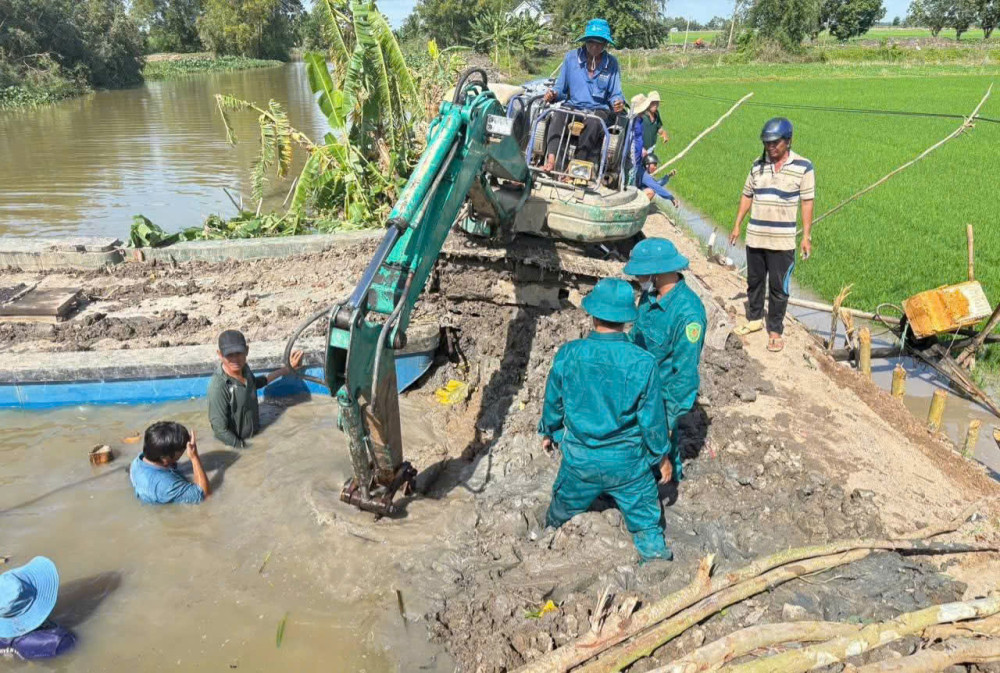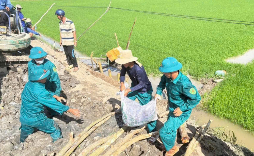 Khoảng 220ha lúa tại xã Vĩnh Châu, tỉnh Tây Ninh bị nước lũ đe dọa, chính quyền địa phương phối hợp người dân tiến hành gia cố đê bao bảo vệ lúa.