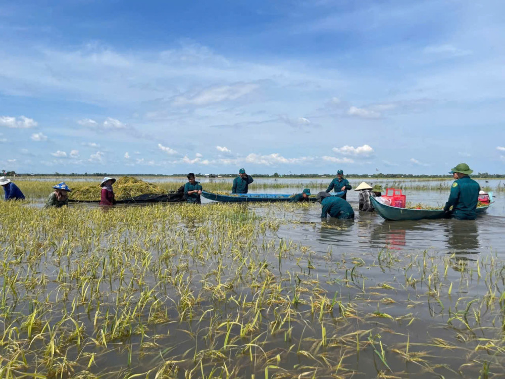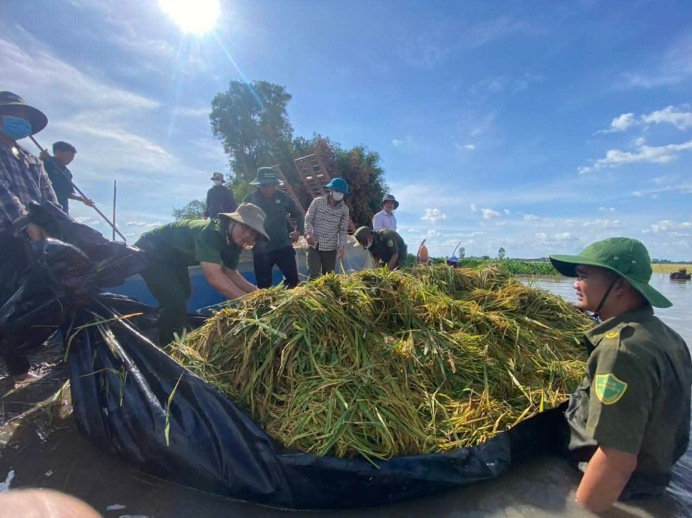 UBND xã Vĩnh Hưng, tỉnh Tây Ninh huy động lực lượng, kịp thời giúp dân thu hoạch gần 2ha lúa bị nước lũ nhấn chìm.