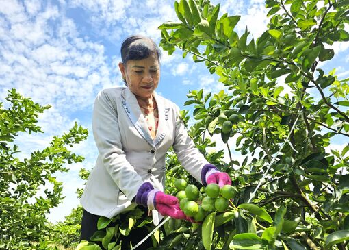 “Từ khi trồng chanh, tôi được tham gia nhiều lớp tập huấn, chuyển giao khoa học - kỹ thuật, rồi còn được tiếp cận nguồn vốn vay để đầu tư sản xuất. Hiện tại, vườn chanh của tôi từng bước ứng dụng công nghệ cao như tưới nhỏ giọt, ghi chép nhật ký canh tác, sử dụng phân bón, thuốc bảo vệ thực vật đúng quy định, cách ly đúng ngày,... Nhờ vậy mà chanh lúc nào cũng đạt năng suất cao, trái đẹp, thu nhập từ vườn chanh rất ổn định” - bà Thẹn chia sẻ.